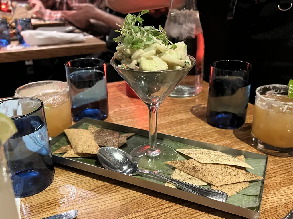 Both Chefs Steen and James shared that the dishes they found in the cookbooks or heard of from Mr. Cisneros had a lot in common with insular Caribbean and African American cuisines. I too had this sensation, particularly with the first appetizer, “Mariscos Enamorados” (Seafood in Love), a seafood salad from Guerrero eaten on crackers. It reminded me of seafood salads I had as a child in the US Virgin Islands.